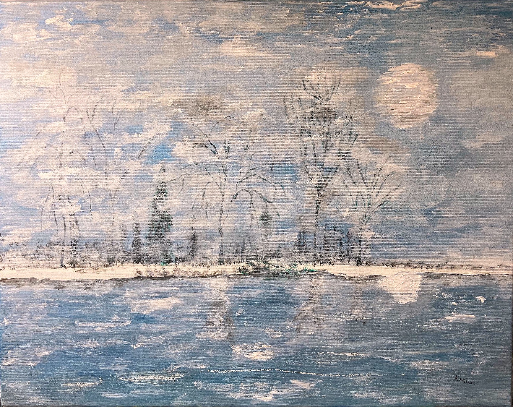 ‘Serene Onondaga Lake #4’ 22″x28″ original acrylic. Painting has finished sides with wire on back for ease in hanging.